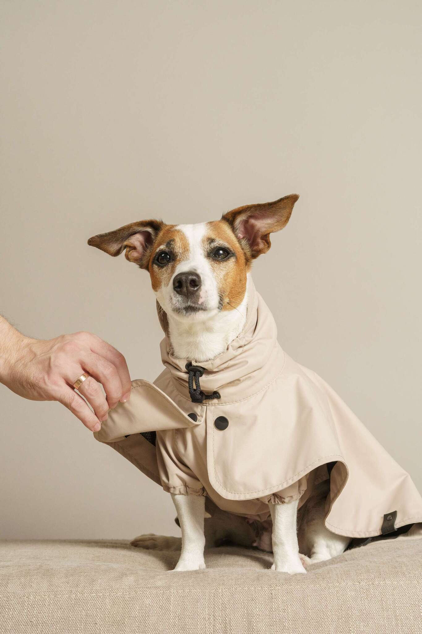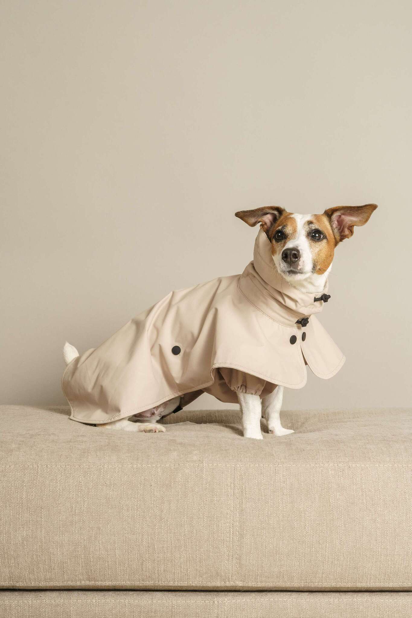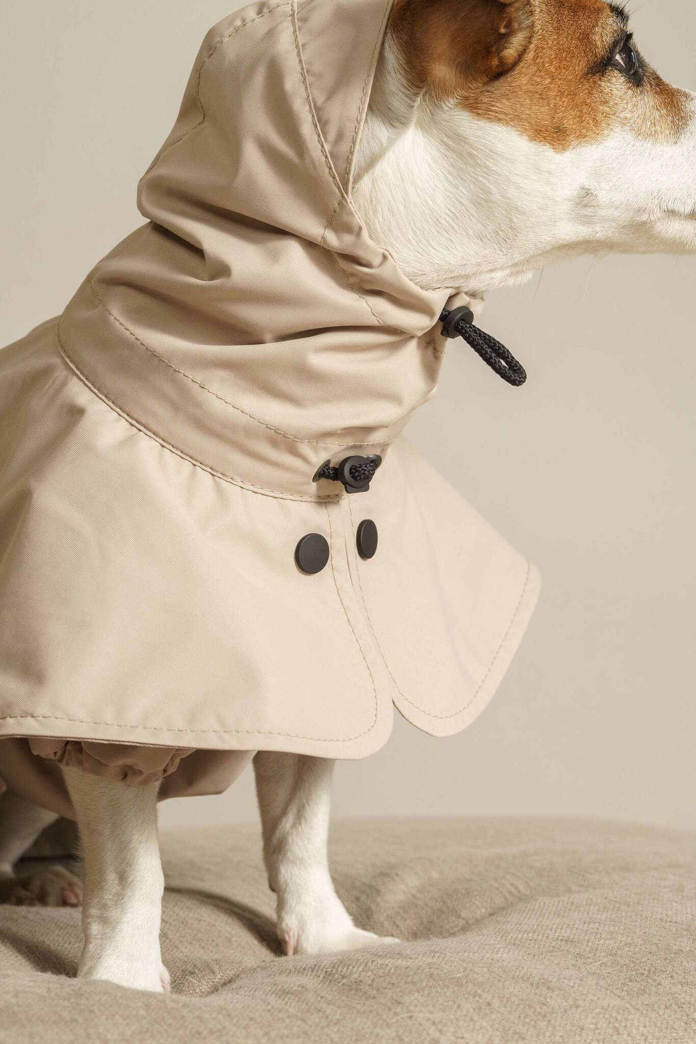 Сконструирован дождевичок таким образом, что капли дождя легко стекают, как с зонтика. В модельке есть капюшон, грудка, а животик и передние лапки закрыты.